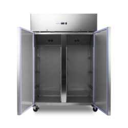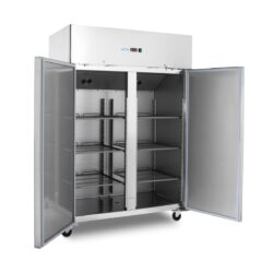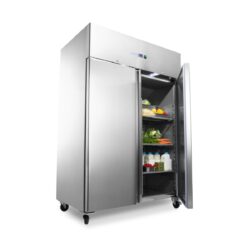 A friss alapanyagokat és a fogyasztásra kész ételeket hűvösen kell tartani, hogy tovább elálljanak. Ez a rozsdamentes acélból készült, 1200 literes hűtőszekrény kibővített hűtési lehetőségeket kínál vendéglátóhelyének. A belső tér energiatakarékos LED-világítással és hat magasságban állítható polccal van felszerelve, amelyek alkalmasak 2/1 GN tartályok elhelyezésére. Az antibakteriális gumitömítéssel ellátott ajtó beépített zárral rendelkezik.