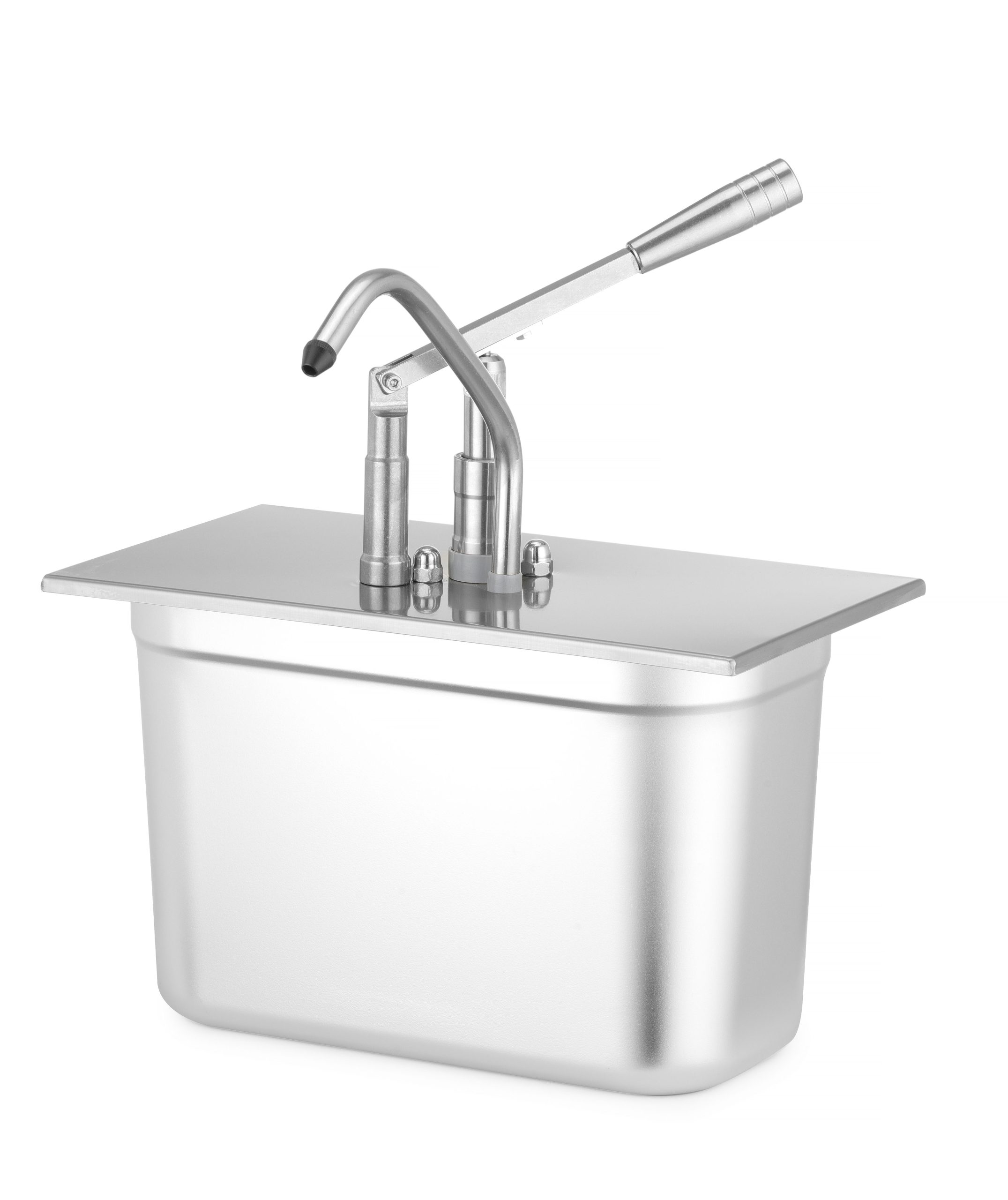 A ház, az adagoló rugója és a mechanikus rendszer AISI 304 rozsdamentes acélból készült. Az adagoló alsó része polipropilénből készült. Levehető: fedél, adagolópumpa. Adagolt szósz mennyisége: 35 ml. Nem mosogatógépben mosható. 3 méretben kapható: GN 1/6 (kód: 558133) GN 1/4 (kód: 558140) GN 1/3 (kód: 558157) 200 mm magas GN edényekhez alkalmas (nem tartozék).
