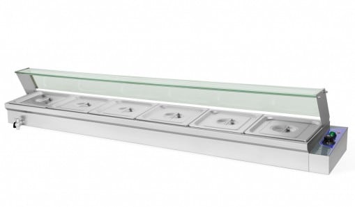 A melegítő állványt úgy tervezték, hogy pultra helyezzék. Védőüveg borítással van ellátva. Az üveget ugyanabban a csomagban szállítjuk, beleértve a rögzítéshez szükséges tartókat és oldalpaneleket. Az üveg fedi a vízfürdő elejét és tetejét, oldalain pedig rozsdamentes acél fogantyúk találhatók. Maga a vízfürdő teljes egészében rozsdamentes acélból készült. 6 db GN 1/2 5,5 literes fedővel 1 db fűtőelem 1,8 kW teljesítménnyel Termosztát 30°C – 110°C Leeresztő szelep Hosszúság 171,5 cm Mélység 35 cm Magasság 31,5 cm
