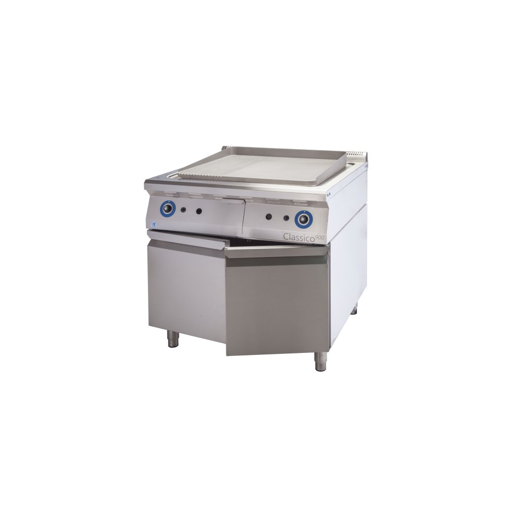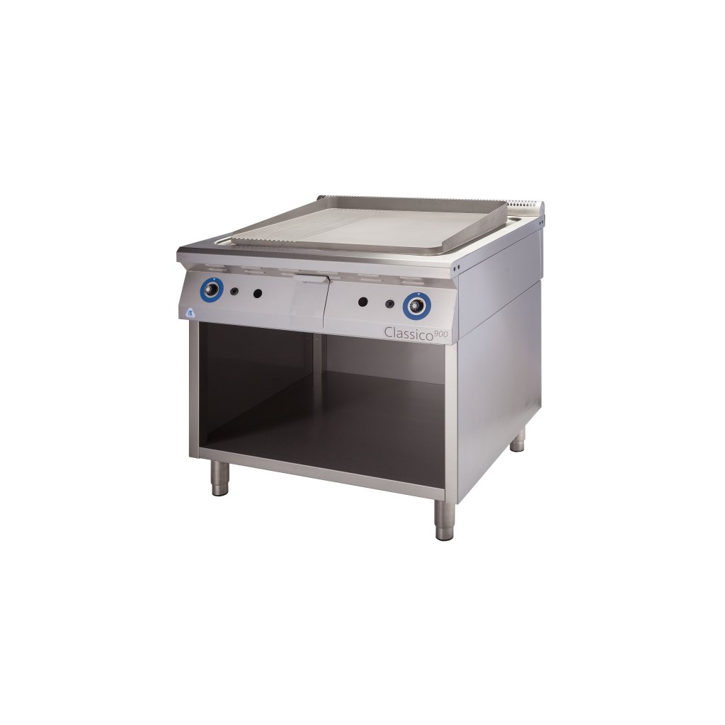 ALBA E-GP-4/900 Elektromos grilllap Változat: FS – 1/3 horony – szabad hely polcokkal A grilllapok 18/10-es rozsdamentes acélból készülnek. Egy felső munkarészből és egy alapból állnak. A felső rész egy keretből áll, saját 12 mm vastag grilllappal. A nagy modulok grillezővel rendelkeznek. A lemez egyharmada barázdált, a fél méretű modellek rácsosak. az egész tábla sima. A keret elülső részén van egy horony, amelyen egy lyuk található a zsír leeresztésére a csepegtető tálcába, amely visszahúzható és az előlap közepén található.