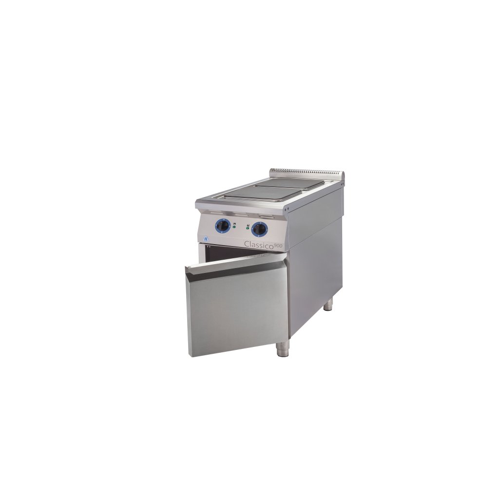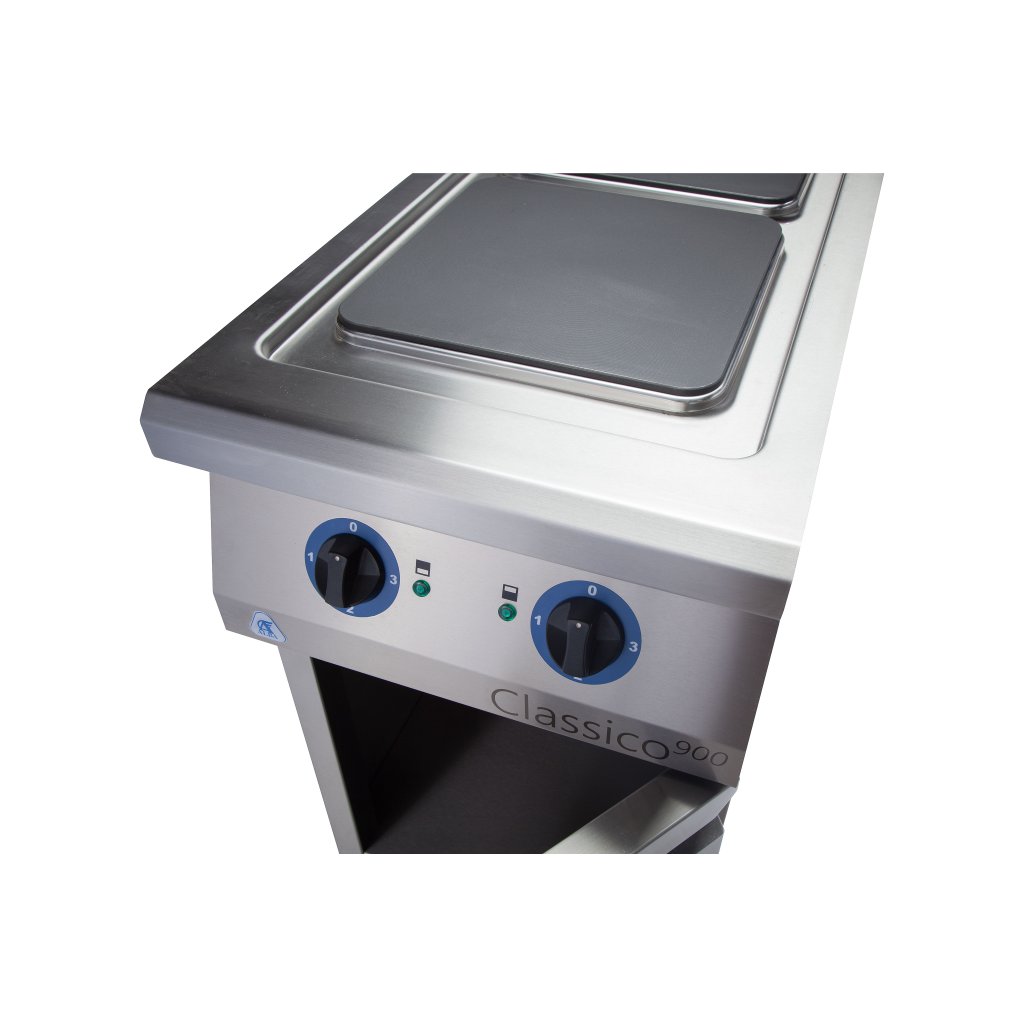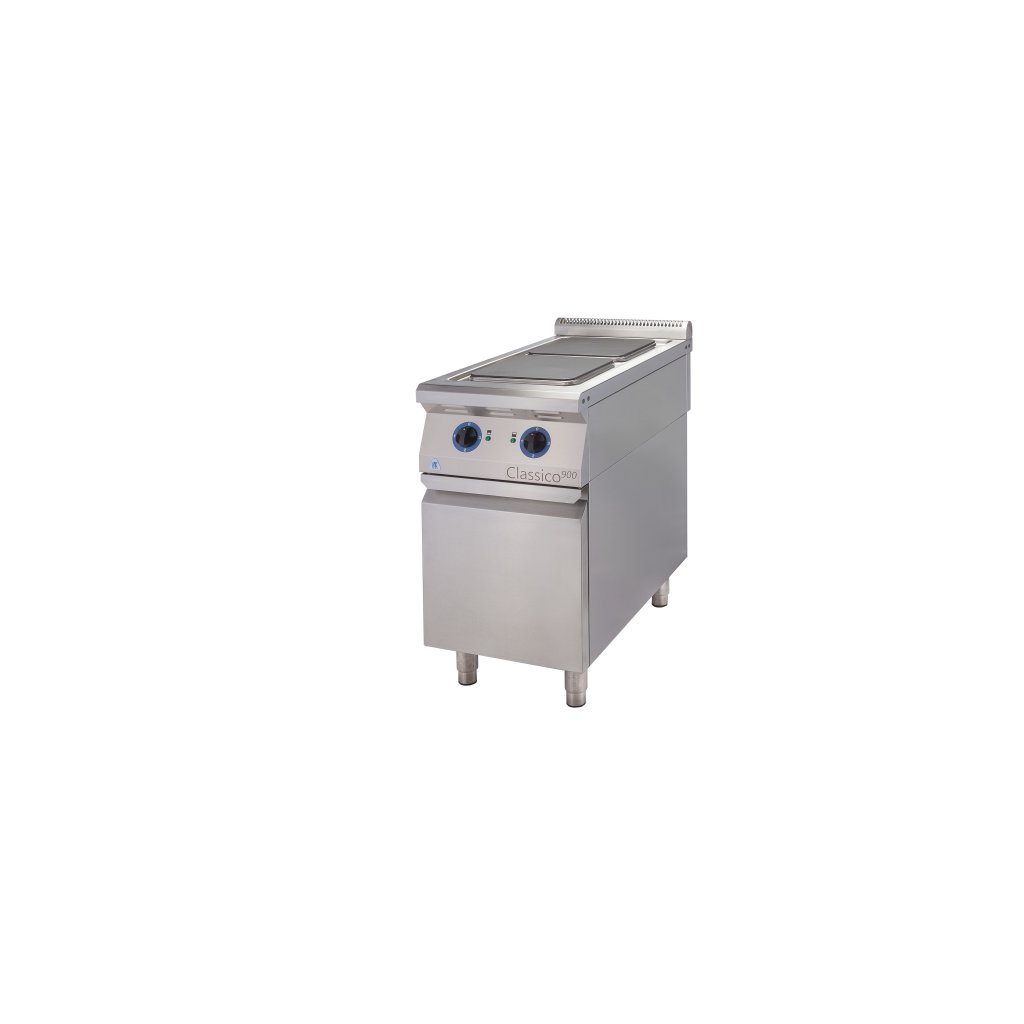 ALBA EC-2/900 Elektromos tűzhely – 2 égős Változat: DS – ajtóval és polccal A kályhák 18/10-es rozsdamentes acélból készülnek. Egy felső főzőrészből és egy alapból állnak. A rugalmas moduláris rendszer lehetővé teszi a főzőrész és az alap egyedi összeszerelését, vagy a főzőrész különálló főzőblokkként is használható. A főzőrész öntöttvas lemezekkel ellátott keretből áll. A fűtőelemek hőmérséklet-szabályozással rendelkeznek egy négyállású kapcsolóval, bekapcsolt állapotjelző lámpával és túlmelegedés elleni védelemmel. Az állványok több változatban készülnek, és négy állítható lábbal vannak felszerelve.
