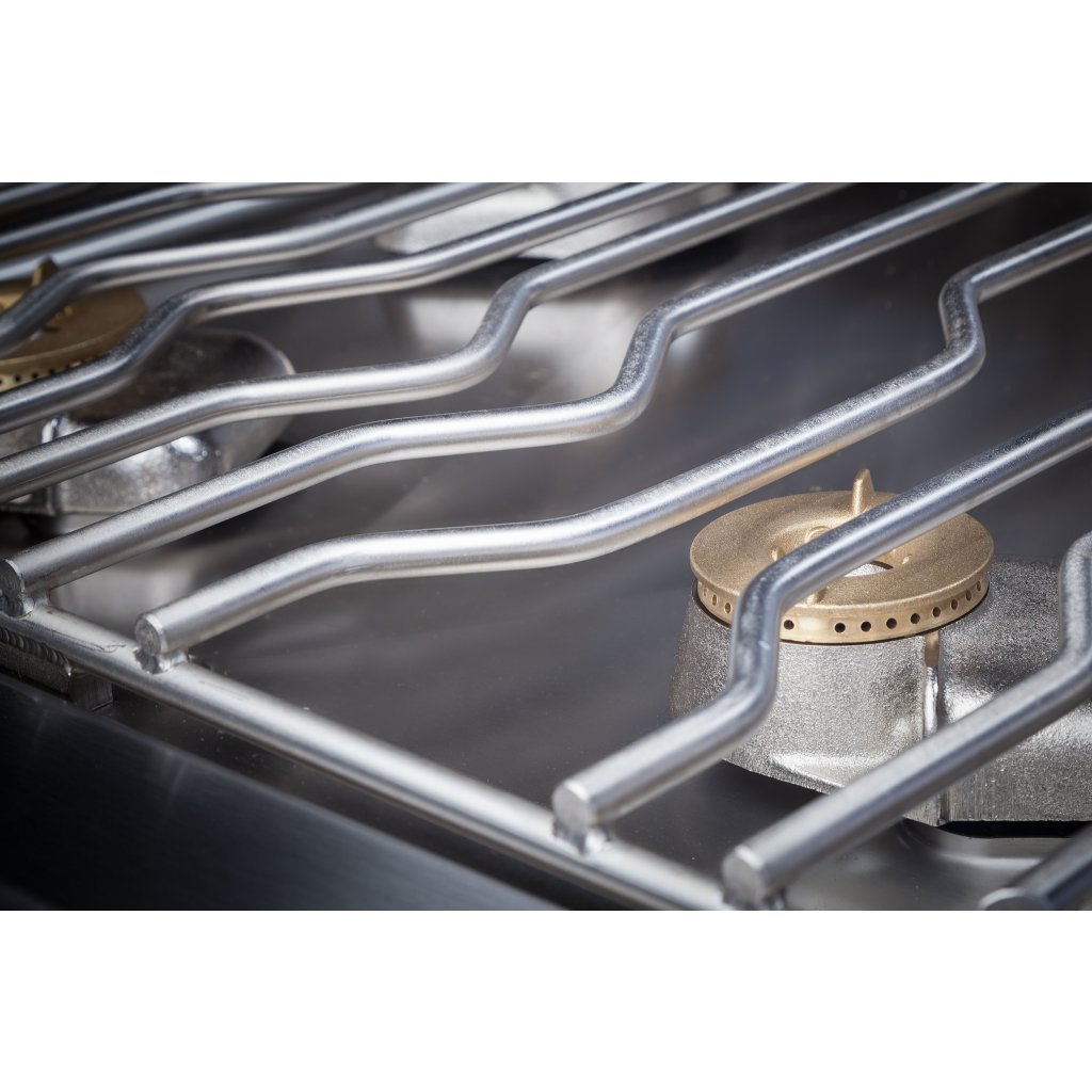 Kivehető rozsdamentes acél kád az égők alatt, a túlcsorduló élelmiszerek kihúzható edénybe ürítésével. Teljesen rozsdamentes szerkezet minőségi élelmiszer-minőségű acélból AISI 304 – EN 1.4301. Az égők gyújtóelektródával, gyújtópisztollyal és termoelektromos biztosítékkal vannak felszerelve. A tűzhely elején található fő gázelzáró gyors és biztonságos leállítást és a lábazatra történő felszerelést tesz lehetővé. Az állványok több változatban állítható lábakkal vannak felszerelve, 2 nyílással a sütő belsejében.