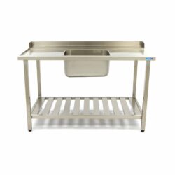 Ez a professzionális mosogatóasztal mosogatóval kiváló minőségű rozsdamentes acélból készült, praktikus oldalfallal és hátfallal rendelkezik. A mosogató alján egy polc található olyan tárgyak tárolására, mint a mosogatókosarak és a mosogatószer. A mosogatóasztal közepén egy mosogató található.