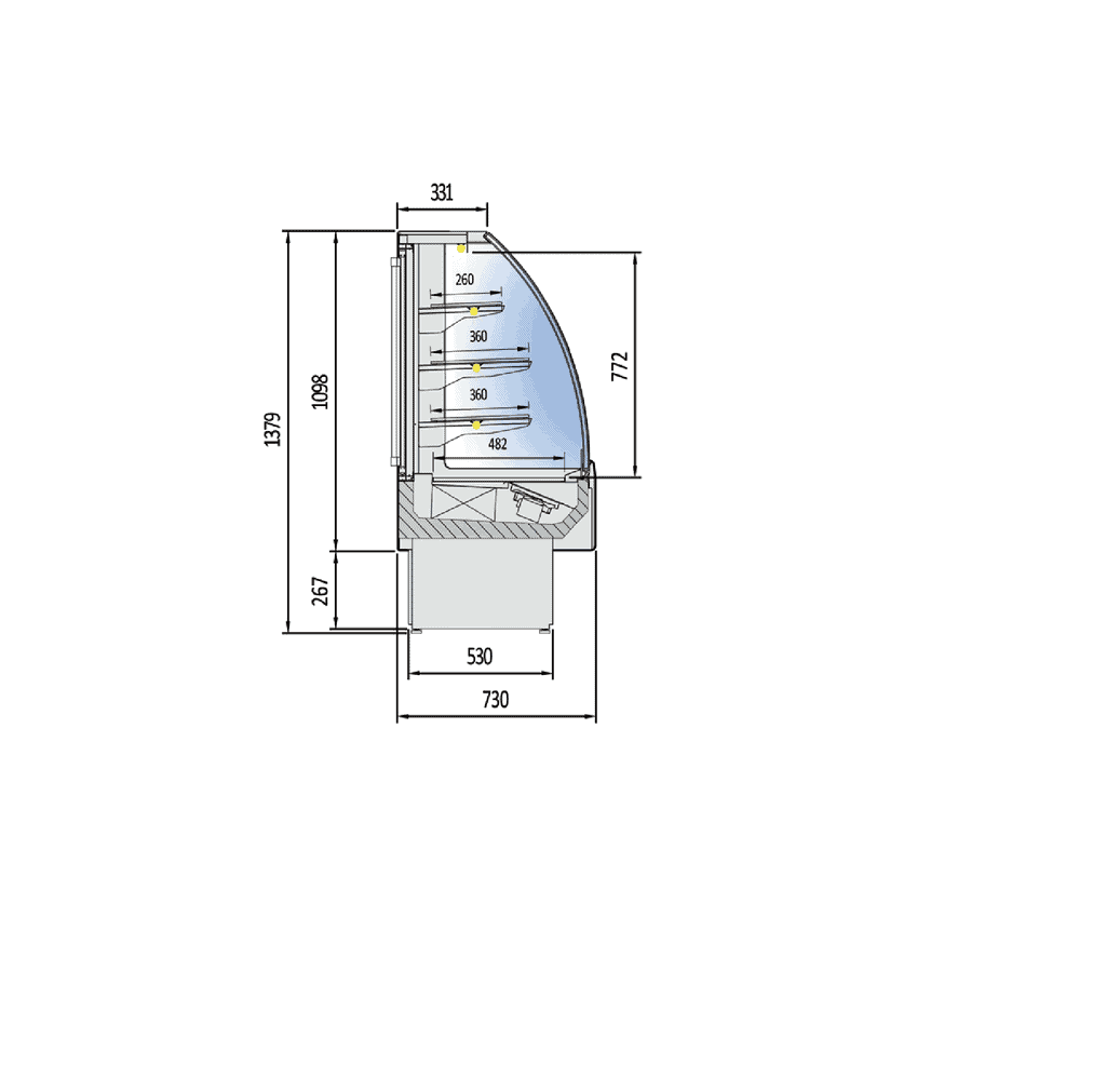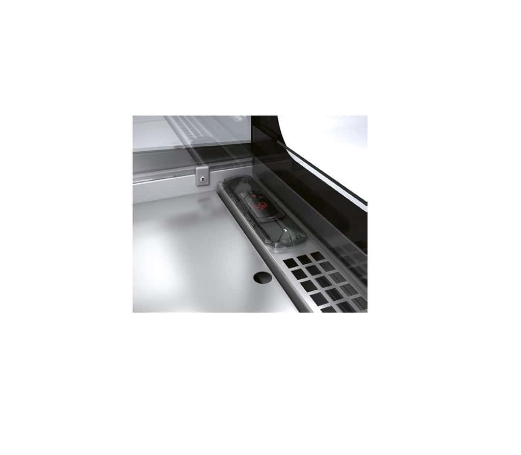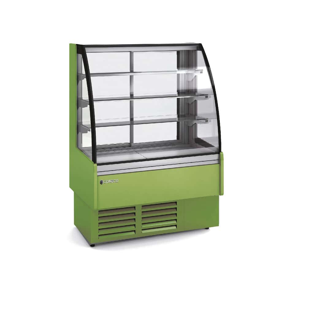 Kerek üveggel ellátott tálaló péksütemény vitrin – Műanyaggal bevont, lakkozott vagy rozsdamentes acél külső felülete – típustól függően – Oldalra fröccsöntött ABS – Belső felület rozsdamentes acélból AISI-304 18/10 – Edzett dupla üvegezés: oldalak és ajtók – Eloxált alumínium profilok – Polcok LED világítással Üvegpolcok / Rozsdamentes acél polcok – OPCIONÁLIS – LED világítás : 2700 K LED (lágy fény) / Rózsaszín / 4000 K – OPCIONÁLIS – Poliuretán szigetelés 40 kg/m³ sűrűséggel, nulla ODP és GWP – Szellőztetett elpárologtató – Automatikus leolvasztás és automatikus párologtatás – Szellőztetett kondenzáció – Elektronikus hőmérséklet szabályozó – Külső hőmérő – 3. klímaosztály (25°C 60%) M1 üzemmód TARTALMAZZA AZ ÁRÁNAK – MAT RAL SZÍN – tetszés szerint választható Fényes vagy fémes felületkezelés felár a modell szerint Hőmérséklet tartomány: +2 – +8 °C Szélesség: 1650 mm Mélység: 730 mm Magasság: 1380 mm Teljes kiállítási terület m2: 2,3 Nettó kiállítási terület m2: 1,66 Nettó térfogat: 417L Ajtók száma: 2 x tolóajtók Hűtőközeg: R290 Hűtőteljesítmény: 1528W Teljesítményfelvétel: 1915W