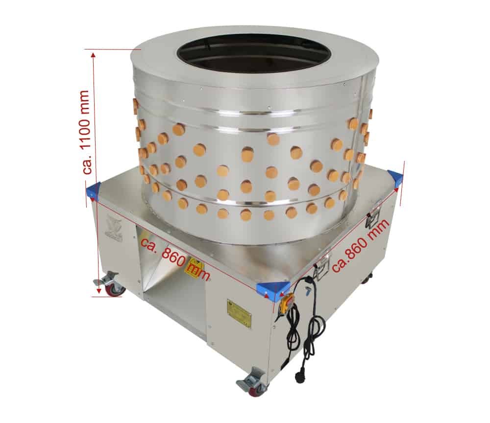 Ne lépje túl a baromfi áztatására vonatkozó hőmérsékletet és időt. A hosszabb áztatási idő miatt a hús és a bőr egyes részei megsülhetnek, és ez problémát okozhat a rántásnál. A megadott idők hozzávetőlegesek, és azt javasoljuk, hogy a gőzölés során manuálisan ellenőrizze a tollak kitépésének könnyűségét. Csatlakozás: 230 V – 50 Hz Teljesítmény: 2200 watt Kapacitás (darab/menet): 3 – 20 Mennyiség (darab/óra): kb. 400-500 Rántási idő: kb. 120 másodperc Dob átmérője: kb. 800 mm Teljes töltet: max. 32 kg 1 darab baromfi max. súlya: max. 20 kg Méretek: kb. 860 x 860 x 1100 mm Ujjak száma: 233 Nettó tömeg: kb. 106 kg