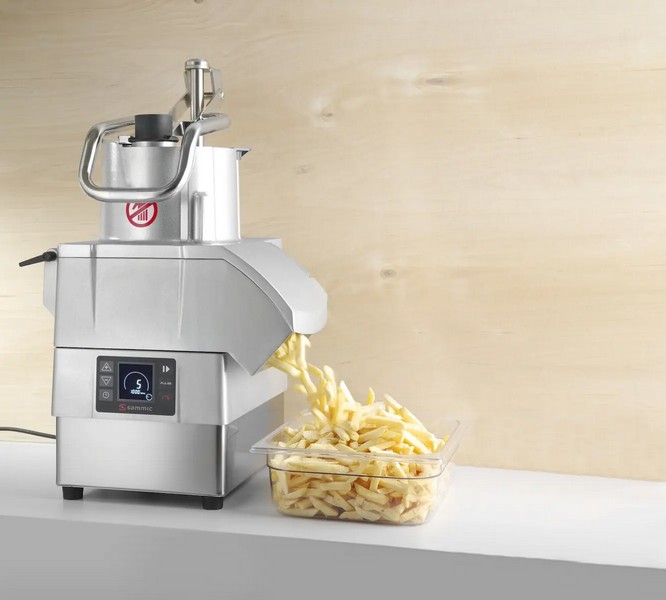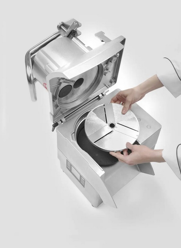 Zöldségek, különösen kényes élelmiszerek vágására és a kívánt formára való kialakítására tervezett berendezés, amely opcionálisan választható tárcsák és rácsok széles választékát kínálja – különböző vastagságú szeletek, forgácsok, tészták, kockák és sült krumpli készítésének lehetősége. Új, intuitív, elektronikus vezérlésű panel, amely megkönnyíti a kezelő munkáját, és számos fontos funkcióval rendelkezik. A kések sebességének finom szabályozása. A "kefe nélküli" technológiának köszönhetően nagy teljesítményű motorok hatékonyan tartják fenn a nyomatékot. A vágóerő-szabályozás biztosítja a legmagasabb minőségű, azonos vágást. A SENCO FORCE funkció riasztást ad ki motor túlterhelés esetén. A FORCE CONTROL funkció mutatja a felhasznált motorteljesítményt. További FORCE CONTROL funkció, amely lehetővé teszi a következők megfigyelését: – motoráram intenzitása – motorteljesítmény egy adott pillanatban – hőmérséklet az IGBT elektronikus modulban – hőmérséklet a motorházon belül. Rozsdamentes acélból és öntött alumíniumból készült, nagy ellenállóképességgel és intenzív munkához való alkalmazkodóképességgel jellemzi. Tárcsaátmérő: 205 mm Sebesség: 300 – 1000 ford/perc. Nagy zöldségadagolóval felszerelve: 136 cm² vagy 286 cm². A kések kialakítása biztosítja az ismételhető vágást. Az oldalsó kivezető nyílás az aprított zöldségek számára lehetővé teszi, hogy a szeletelőt keskeny munkalapra is lehessen helyezni. Profilozott ürítőtárcsa növeli a készülék teljesítményét. Teljesítmény: akár 650 kg/óra. Könnyen levehető fedél nyomáskioldóval Dupla védelem a balesetek ellen: a motor automatikusan kikapcsol, amikor a fedelet lehajtják és/vagy a nyomáskioldót felemelik