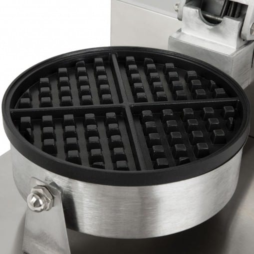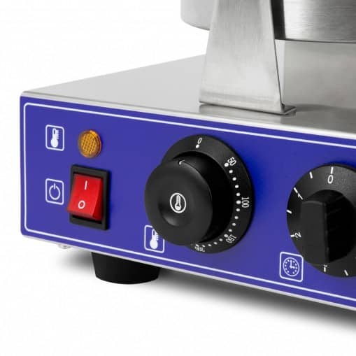 Háromszög alakú brüsszeli gofrisütő Vastag sütőlapok kétoldalas fűtéssel Rozsdamentes acél teflon tepsi Időzítő jellel Biztonságos hőálló, nem vezető rács Feszültség 220V – 240V Állítható termosztát 50 °C – 250 °C Teljesítmény 2 x 1000W Gofri átmérő 18 cm Height 27 cm Szélesség 50 cm Mélység 36 cm Kereskedelmi használatra tervezték