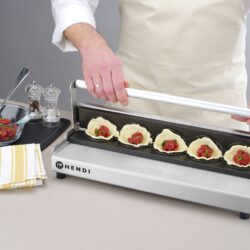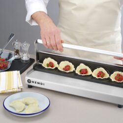 5 ravioli / pierogi egyszerű elkészítéséhez egyszerre. Rozsdamentes acél test szálcsiszolt felülettel. Alumínium fogantyú. Rozsdamentes acél zsanérok kötik össze a forma 2 részét. Tapadásmentes felületű munkafelület – a kész gombócok könnyű kivétele érdekében. Fogantyú a forma teljes hosszában – az egyenletes nyomás és a kényelmes irányítás érdekében. 4 gumi csúszásgátló lábbal. A gombóc maximális vastagsága és átmérője: 21 mm, ø80 mm. A gombóc "peremének" szélessége: 8 mm. A nyitott gombóckészítő méretei: Méretek: 470x245x80 mm. Nem mosogatógépben mosható. FIGYELMEZTETÉS: a bevonat károsodásának elkerülése érdekében ne használja a gombóckészítőt tészta nélkül. Ne mossa a bevonatot erős mosószerekkel és durva szivaccsal.