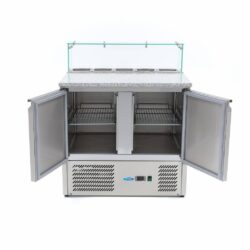 Ha minden nap friss pizzát készítesz a legfinomabb feltétekkel, akkor ez a gyönyörű hűtött előkészítő állomás kötelező darab a konyhádban. A pizzahűtő gránit munkalapjának köszönhetően a tészta nem ragad le, így kinyújtható és használatra kész. A tetejére rögzített hűtött vitrinnek köszönhetően minden kedvenc feltéted nemcsak látható, hanem az utolsó pillanatig hűvös is marad. Ez a prémium konyhai készülék rozsdamentes acél tartókkal is rendelkezik a GN edények tartásához, bár az edények és a fedők nem tartozékok. Ezek külön megrendelhetők az online áruházban.