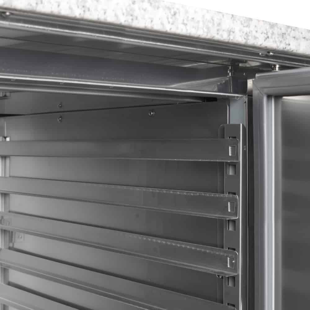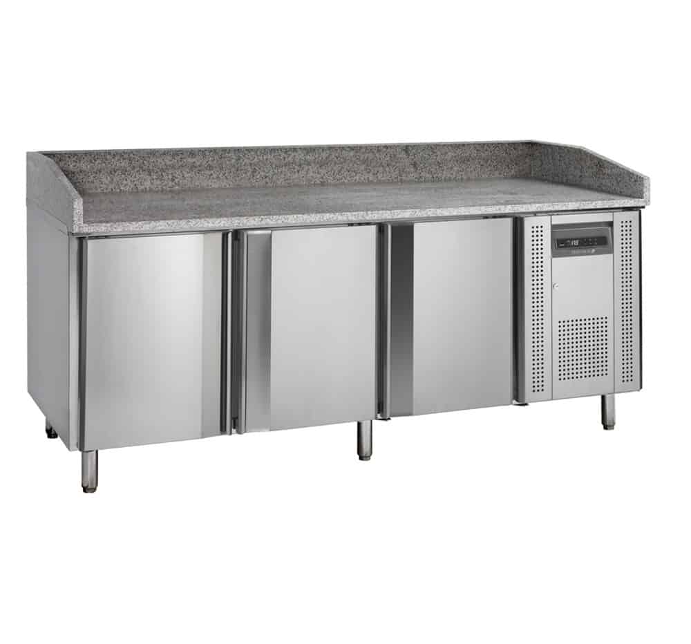 új dizájn, rozsdamentes acél, ajtónként 7 db pizzatálca fiók (400 x 600 mm), gránit munkalap, szellőző hűtés, automatikus leolvasztás, önzáró ajtó, állítható lábak