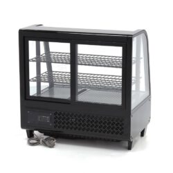Ez az ívelt elülső ablakkal ellátott vitrin minden pékség, kávézó, söröző vagy más vendéglátóhely igazi kincse. 100 literes űrtartalmával és két állítható magasságú polcával különféle termékeket hűthet. A belső LED-világításnak és az oldalanként négy ablaknak köszönhetően a termékek szépen bemutathatók és könnyen láthatók. A hátsó tolóajtó megkönnyíti a termékek hozzáadását és kivételét.