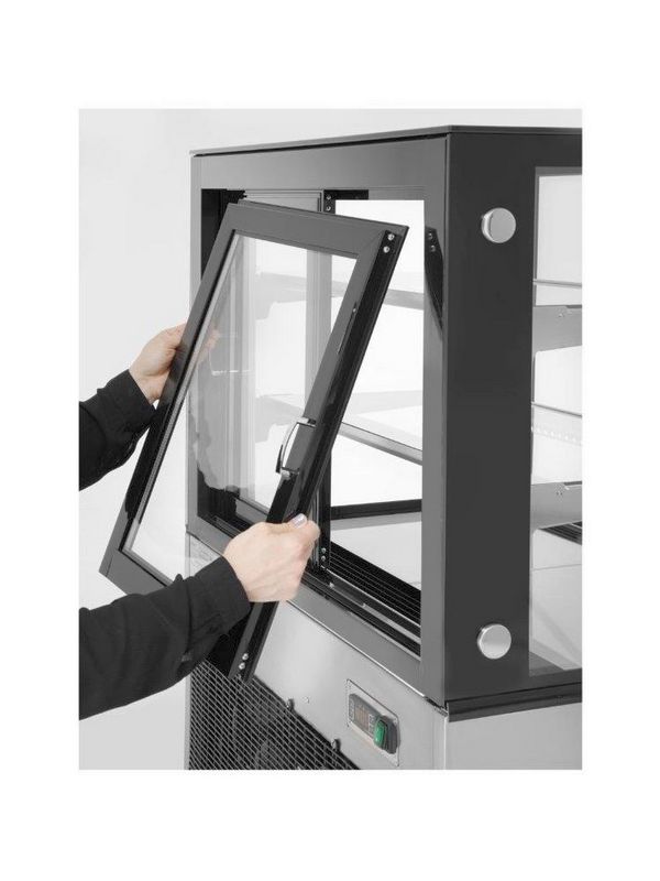 Professzionális vendéglátásban való használatra Rozsdamentes ház dupla üvegezéssel Digitális termosztát és kijelző Belépés a belső térbe a hátsó kétrészes tolóajtón keresztül 2 állítható üvegpolc Kényszerhűtés automatikus leolvasztással, kompresszor a szekrény alatt található Hőmérséklet tartomány: 0 °C – 6 °C Hűtőközeg: R290 Fényerős LED világítás mellett (legfelső fAGl) 4 görgő, 2 fékkel. Rozsdamentes acél test dupla üveggel. Belépés két hátsó tolóajtón keresztül. Szellőztetett hűtőrendszer automatikus leolvasztással, kompresszor a kamra alatt található. Fényes LED-es világítás minden polc tetején és alatt. 4 keréken, ebből 2 fékkel. Digitális hőmérséklet-szabályozó és kijelző. Hőmérséklet tartomány: 0-6 ˚C. Klímaosztály: 4. Hűtött vitrinek hátulról elérhető