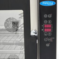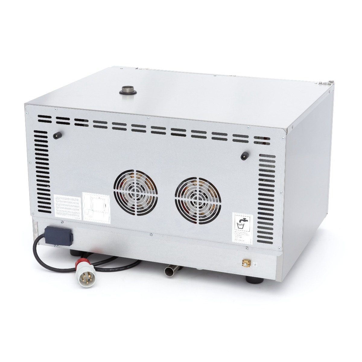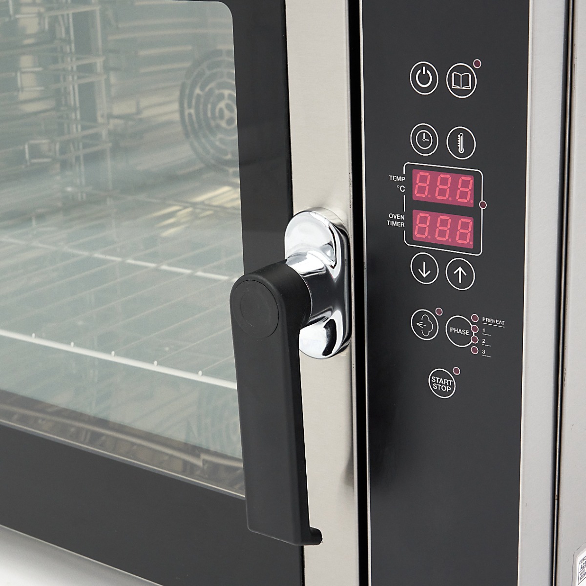 Ez a kombinált gőzsütő nagy teljesítményű rozsdamentes acél fűtőelemekkel rendelkezik, amelyek biztosítják a teljes és hatékony hőeloszlást, így a hús és a hal egyenletesen sül. Ezenkívül a kombinált sütő két ventilátorral van felszerelve, amelyek fordított funkcióval és dupla athermal üvegezéssel rendelkeznek. Az ajtó nagyon könnyen állítható, az ajtótömítés pedig élelmiszeripari minőségű szilikonból készült. A belső világításnak köszönhetően könnyen láthatja, hogy milyen előrehaladott állapotban van a sütési folyamatban. Ez a készülék vízbemenettel és gőzszeleppel, valamint vízkimenettel is rendelkezik. Teljesen testreszabható készülék, egyszerű digitális kijelzővel és érintőgombokkal. Számos előre beállított program áll rendelkezésre három állítható fázissal, beleértve a gőzölési szintet, a hőmérsékletet és az időt. Az előre beállított programokat a fázis gombbal állíthatja be. Az előre beállított program szerkeszthető és menthető a kombinált sütő memóriájába is.