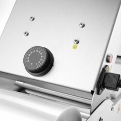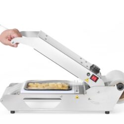 Rozsdamentes acél konstrukció. Rugós fedéllel felszerelve a könnyű és biztonságos nyitás érdekében. Szigetelt, sérülésálló műanyagból készült fogantyú. Automatikus vágógép biztonsági késsel, speciálisan kialakított burkolatban; a vágás közvetlenül a zárt tartály mögött történik egy speciális szalagban (légkeveréses vágási technológia). Csúszásgátló lábak védik az asztallapot a karcolásoktól. A tömítőfelület titánbevonattal rendelkezik, amely megakadályozza a fólia letapadását, és lehetővé teszi a gyors lezárást 1-3 másodpercen belül (a fólia vastagságától függően). A nyomáselnyelő biztosítja a szoros lezárást és megakadályozza a csomagolás összenyomódását. Színkódolt LED-ek a teljesítmény ellenőrzéséhez. Túlmelegedés elleni védelem, túlmelegedés elleni védelem, megvilágított biztonsági kapcsoló. Melegítési idő teljes üzemmódba kapcsolás után – körülbelül 8-10 perc. Legfeljebb 235x190x(M)155 mm méretű tartályok és legfeljebb 115 mm méretű csészék lezárása. Maximális fóliatekercs méret: szélesség 187 mm, ø170 mm – a fólia külön kapható (kód: 970720). 227×178 mm méretű konténerekhez való alumínium matricával (kód: 805572), elválasztó nélkül.