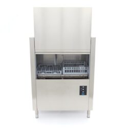 Ez a kosaras szállítószalagos mosogatógép ideális nagy mennyiségű edény mosogatására, különösen egy forgalmas napon. A szennyes edények kosarai gyorsan és könnyedén áthaladnak a kosaras szállítószalagon, amely alaposan lemossa őket, tisztává varázsolva és készen a következő használatra. Ez az ipari mosogatógép óránként 60-120 kosarat képes elmosni. A mosogatógép bal oldalán egy rozsdamentes acél görgős asztallal bővíthető.