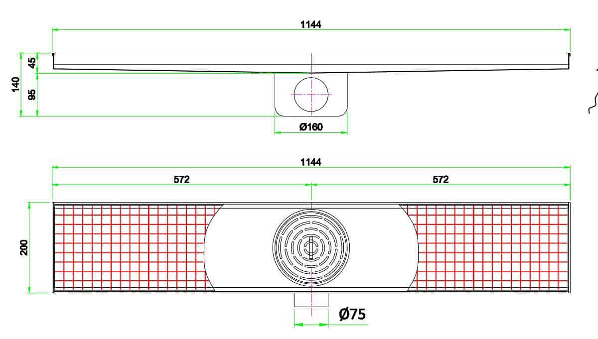 Szélesség (mm): 1144 Mélység (mm): 200 Magasság (mm): 140 Anyaga: Rozsdamentes acél AISI 304 Lefolyó csatlakozás (mm): 75