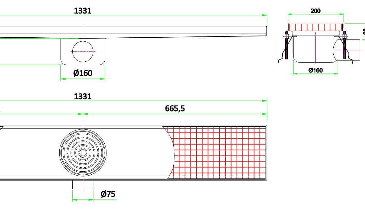 Szélesség (mm): 1331 Mélység (mm): 200 Magasság (mm): 140 Anyag: Rozsdamentes acél AISI 304 Lefolyócsatlakozás (mm): 75