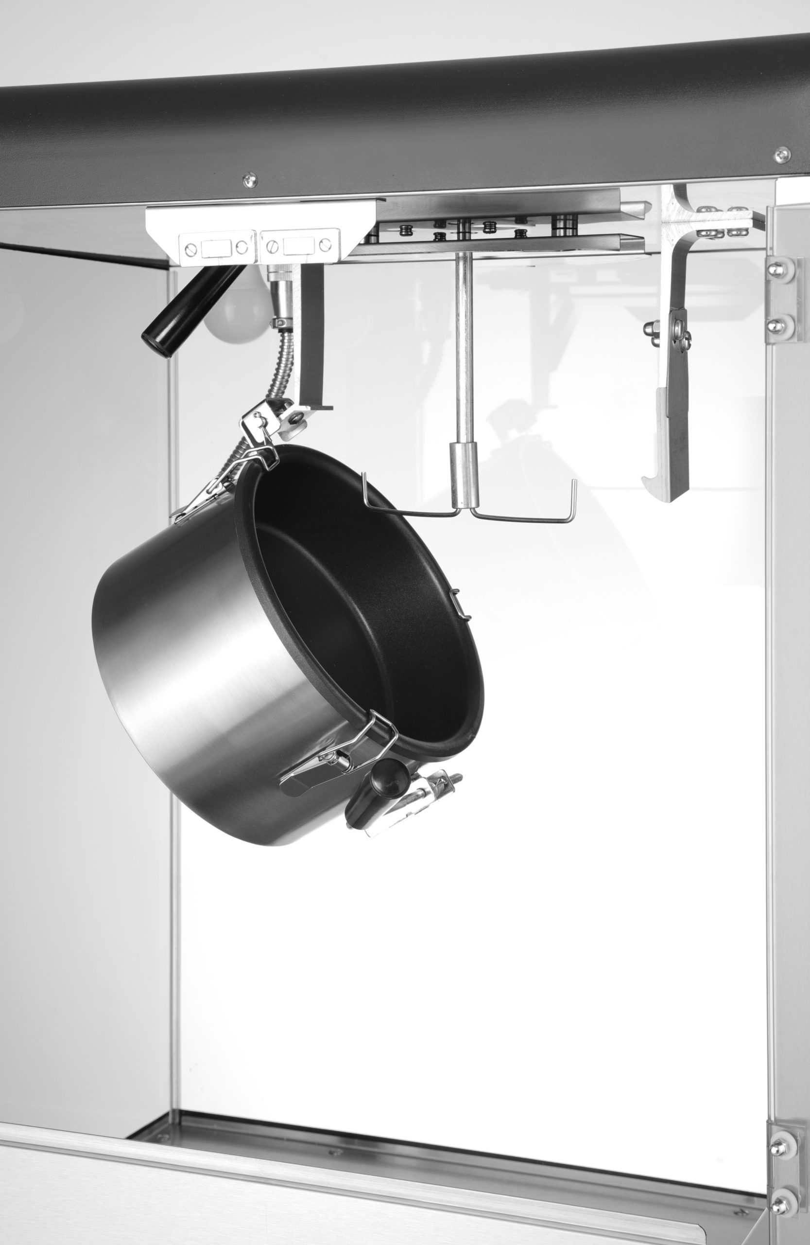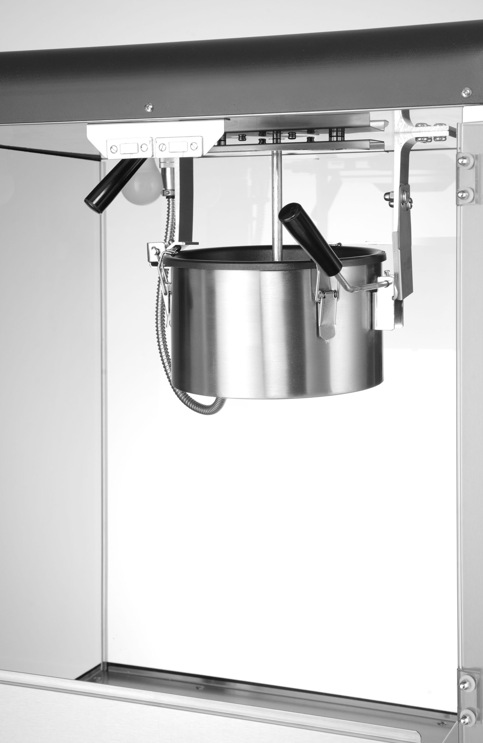 A ház szénacélból készült. Edzett üvegből készült zsanéros szervizajtó. Öntött alumínium tartály. PC mérőpohárral. Pattogatott kukoricával és keverőegységgel ellátott melegítőtartály. Nem melegítő anyagból készült fogantyúkkal ellátott fedél. Pattogatott kukorica-merítő fedél. Morzsafiók a kamra alatt a bevonat nélküli szemek és a morzsa eltávolításához. Megvilágított belső tér. A pattogatott kukorica kamra fűtött alja. Ciklusidő: ≈3,5 perc – 150 g kukoricaszem ciklusonként
