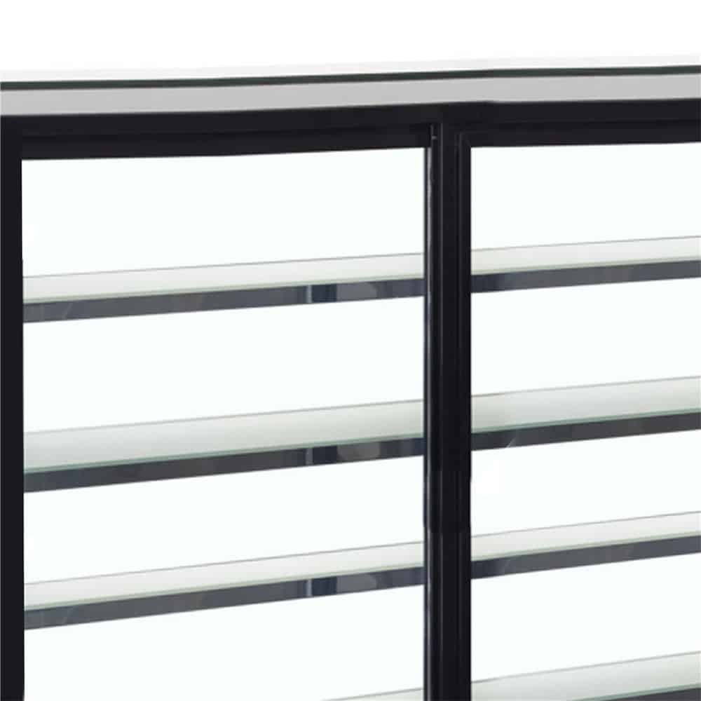 kiváló polctér, rozsdamentes acél és fényes fekete üvegkeret, dupla üvegezés, páramentes első üveg, LED világítás minden polc alatt, hátsó tolóajtó, szellőző hűtés, lapos üveglap